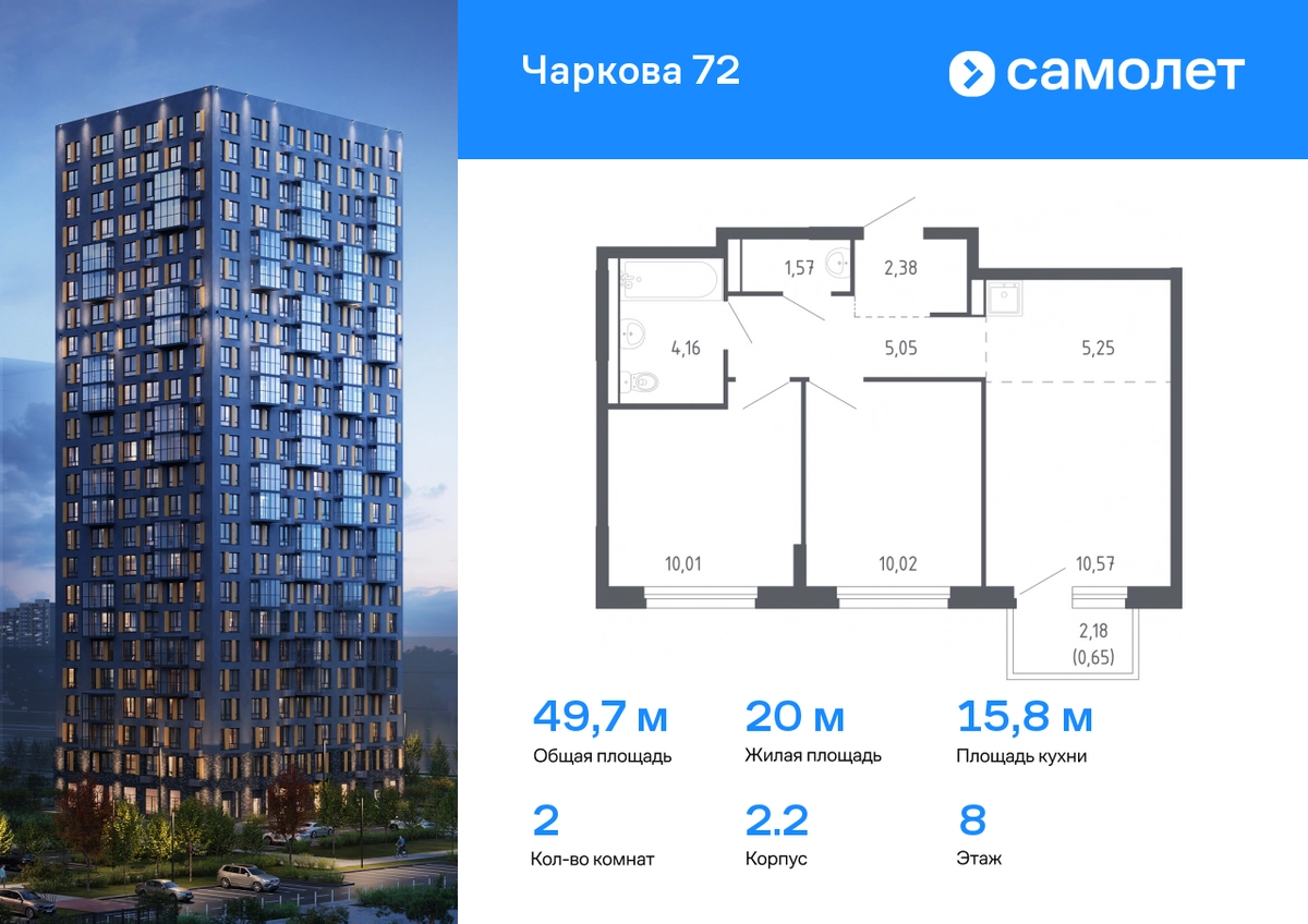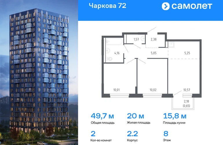 Предлагается 2-комнатная квартира комфорт-класса 49,66 кв.м в корпусе 2.2 на 8 этаже, в ЖК «Чаркова 72» Квартира с предчистовой отделкой. Доступность дополнительных опций уточняйте у застройщика. Приобрести квартиру возможно по специальным акциям от застройщика, с текущими условиями акций можно ознакомиться в блоке «Акций». Цена динамическая и может отличаться, уточняйте актуальность у застройщика. Идеальное сочетание городского комфорта и размеренной жизни — квартал «Чаркова 72» на северо-востоке города. В дизайне 17-24-этажных домов с панорамными балконами нашли отражение нотки сибирской природы. От «Чаркова 72» удобно добираться до центра города — всего 17 минут пути. А в 2 минутах от дома находится Тобольский тракт. Для семейного отдыха отлично подойдет парк Гагарина — он находится в 7 минутах от квартала. В закрытых дворах тихо и уютно — все авто остались на одном из 4 многоуровневых паркингов, которые находятся за территорией квартала. Можно спокойно гулять по бульвару и заниматься йогой на спортивной площадке. На первых этажах домов — кафе и магазины. Рядом с проектом — детские сады и школы, городская поликлиника и МФЦ. Во всех квартирах есть выводы под кондиционеры, на подземных этажах — индивидуальные кладовые, на первых — места для хранения велосипедов и колясок. В квартирах можно выбрать варианты отделки: чистовая, черновая и улучшенная из материалов повышенного класса.#yan19-2r1810602#О застройщике