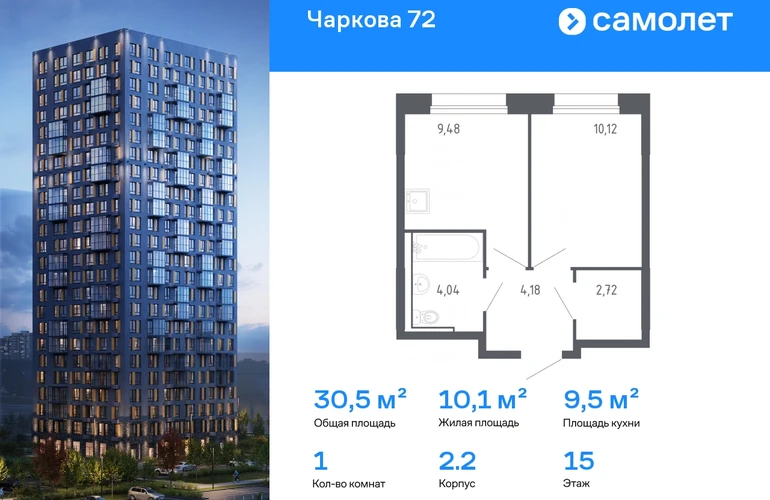 Строим кварталы для жизни с заботой о будущем. Предлагается 1-комнатная квартира комфорт-класса 30,54 кв.м в корпусе 2.2 на 15 этаже, в ЖК «Чаркова 72» Квартира с предчистовой отделкой. Доступность дополнительных опций уточняйте у застройщика. Приобрести квартиру возможно по специальным акциям от застройщика, с текущими условиями акций можно ознакомиться в блоке «Акций». Цена динамическая и может отличаться, уточняйте актуальность у застройщика. Идеальное сочетание городского комфорта и размеренной жизни — квартал «Чаркова 72» на северо-востоке города. В дизайне 17-24-этажных домов с панорамными балконами нашли отражение нотки сибирской природы. От «Чаркова 72» удобно добираться до центра города — всего 17 минут пути. А в 2 минутах от дома находится Тобольский тракт. Для семейного отдыха отлично подойдет парк Гагарина — он находится в 7 минутах от квартала. В закрытых дворах тихо и уютно — все авто остались на одном из 4 многоуровневых паркингов, которые находятся за территорией квартала. Можно спокойно гулять по бульвару и заниматься йогой на спортивной площадке. На первых этажах домов — кафе и магазины. Рядом с проектом — детские сады и школы, городская поликлиника и МФЦ. Во всех квартирах есть выводы под кондиционеры, на подземных этажах — индивидуальные кладовые, на первых — места для хранения велосипедов и колясок. В квартирах можно выбрать варианты отделки: чистовая, черновая и улучшенная из материалов повышенного класса.#yan19-2r1814420#О застройщике